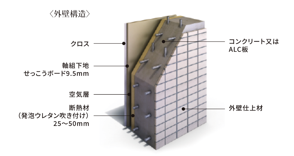 外気に接する壁の室内側に設けた断熱材により、冷気・熱気の侵入を抑え、快適な室内環境を保ちます。