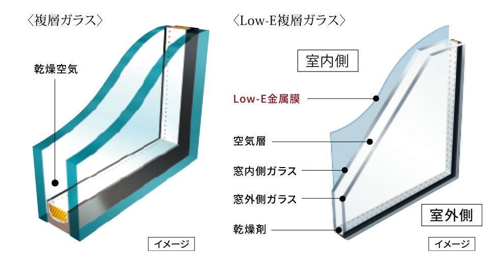 複層ガラスによって熱の侵入や放出を抑え冷暖房効率を高めると同時に、ガラス面の結露も抑えます。また、開放廊下・住戸妻側の窓(一部除く)に断熱タイプのLow-E複層ガラスを採用。特殊金属膜の効果で室内の熱を逃さず冬場の暖房負荷を軽減すると共に、室内を紫外線から守ります。