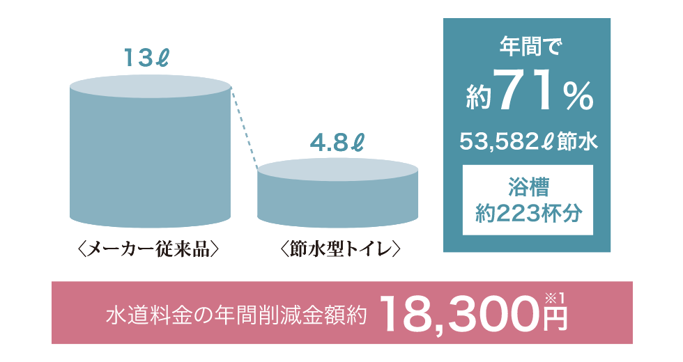※1水道料金 年間約18,300円の節約 ■年間使用日数:365日 ■家族4人(男性2人・女性2人)※大1回/日・人、小3回/日・人※「省エネ・防犯性住宅推進アプローチブック」より/上水道+下水道料金目安単価343円/㎥(和歌山市) ■使用料金の試算結果については原則として100円未満を切り捨てて表記しています。 ■同メーカーの1987~2001年商品(C720R)と比較 ■浴槽1杯約240ℓとして試算。