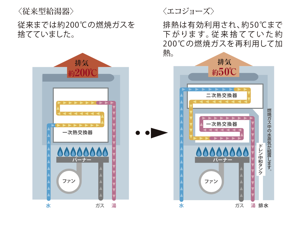 排気熱・潜熱回収システムにより、これまで未利用だった排熱を活用し給湯効率を向上させています。