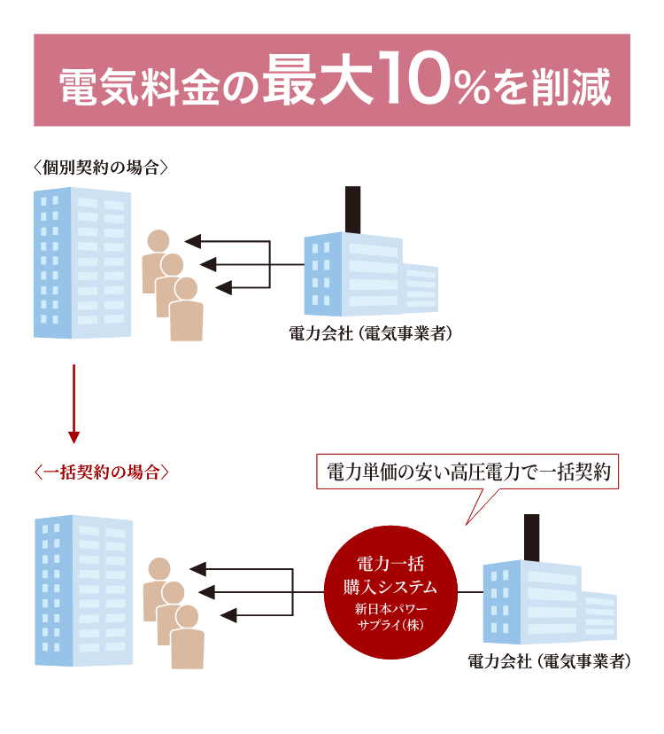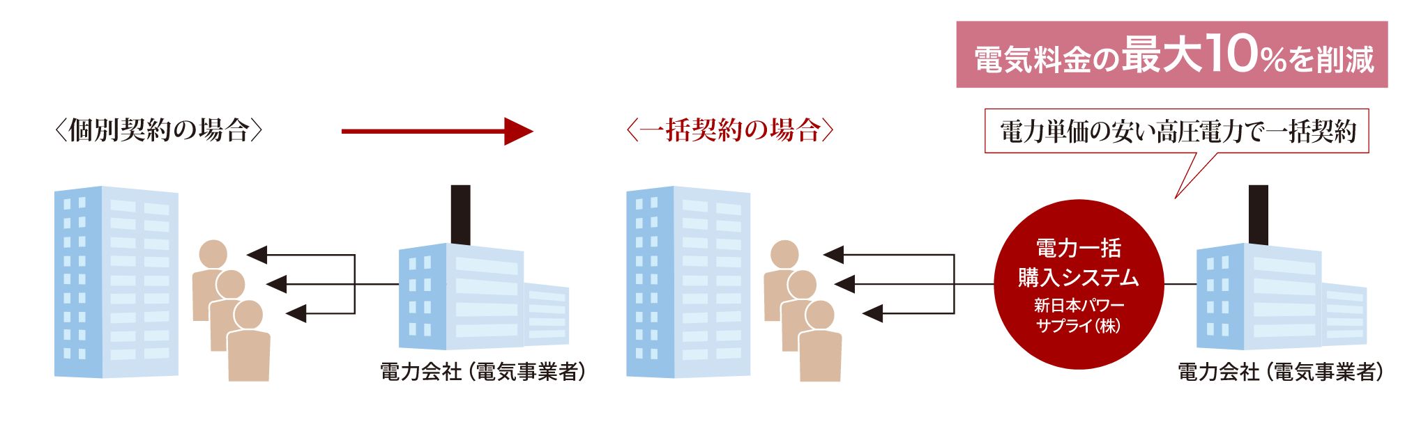 電力単価の安い高圧電力で一括契約する電力一括購入システムを採用。