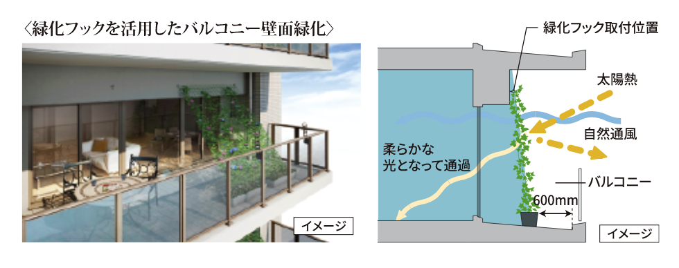 夏場の室温上昇を抑え、光熱費軽減にも有効とされる壁面緑化対策としてメインバルコニーに緑化用の取付用金具を設置。市販のフック(アイボルト)をねじ込み、ネットをかければ、アサガオ、キウイなどのツル性植物で壁面を飾ることができます。