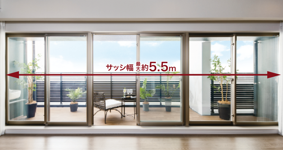 広い開口が豊かな光と風を招き入れるワイドサッシ。明るく開放的な室内を演出します。