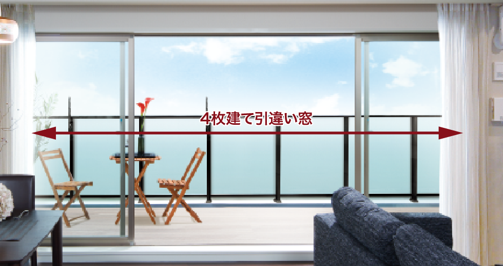 4枚建て引違い窓なので中央でも両サイドでも広く開放できて、心地よい開放感と風通しを感じることができます。