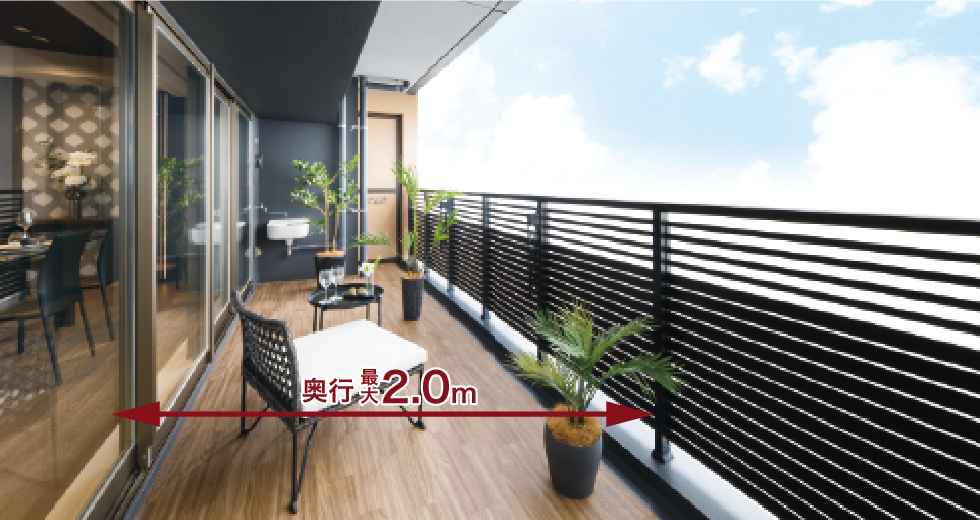 室内から続くような開放感を演出する奥行最大2.0mのバルコニー。ガーデニングなど楽しみが広がります。