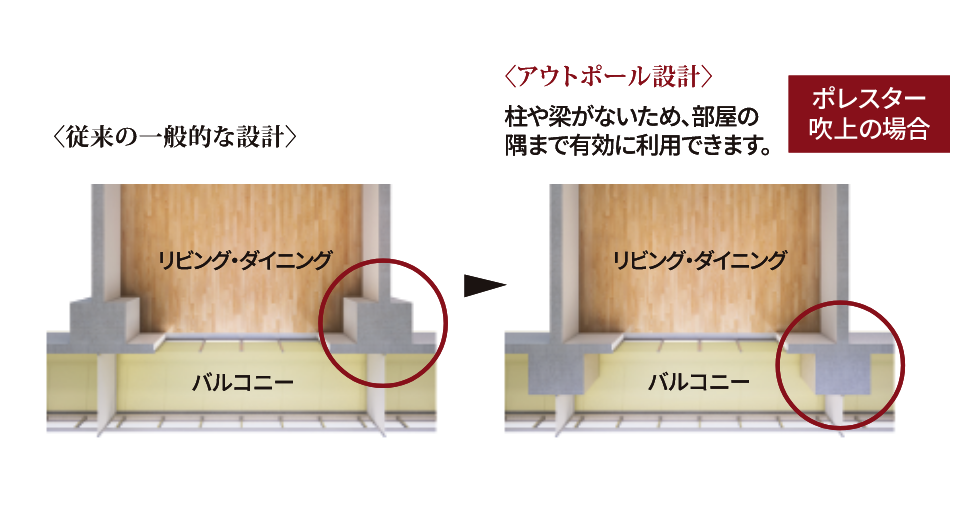 柱、梁をバルコニー側に押し出すアウトポール設計。部屋のコーナーがすっきりし家具の配置がしやすい構造です。