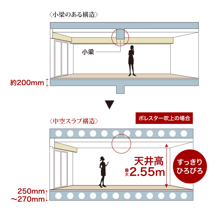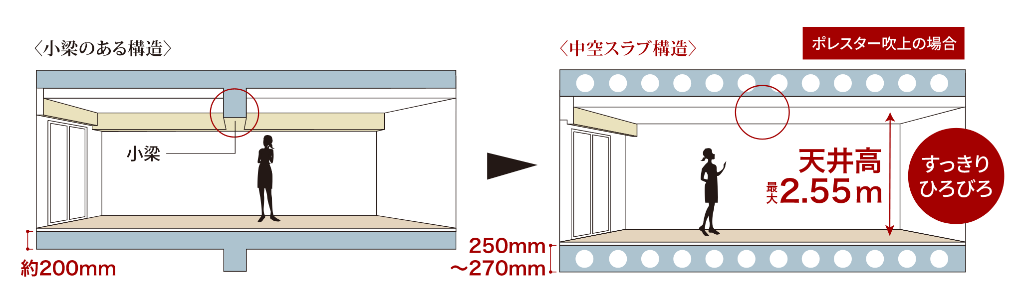 住戸内の開放感に大きな影響を与える天井高は、最大2.55mを確保。ゆとりある高さに加え、スラブ厚250〜270mmの中空スラブ構造を採用することにより、小梁の出ないすっきりとした室内空間を実現しています。
