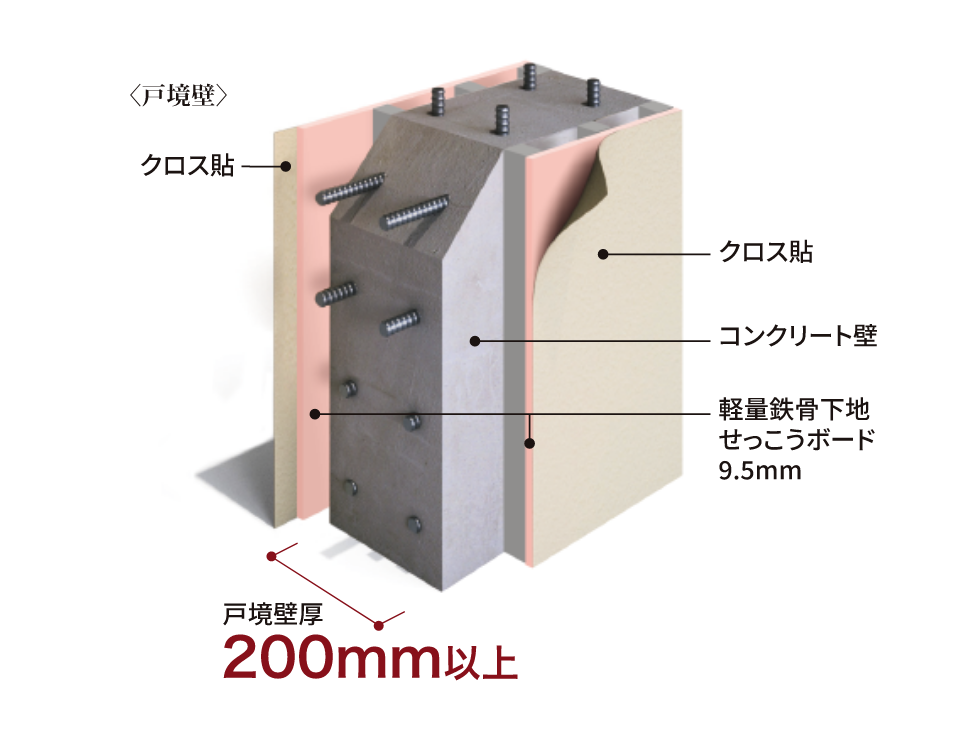 隣戸への音漏れに関係する戸境壁のコンクリート厚は、200mm厚以上として、日常生活に不便のない遮音性を実現しています。