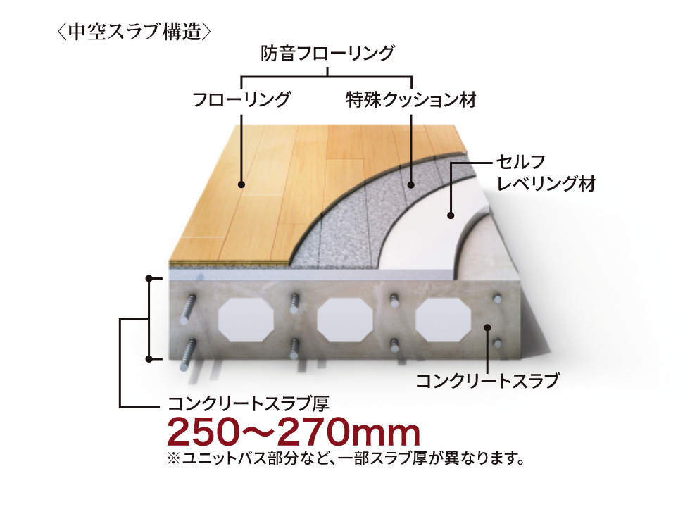 生活音の中で低音域の重い音(重量衝撃音)に対しては、250〜270mmの中空スラブ構造を、高音域の軽い音(軽量衝撃音)に対しては軽量床衝撃音低減性能がΔLL(Ⅰ)-4等級のフローリング材を採用し階下への音の伝わりを抑えています。