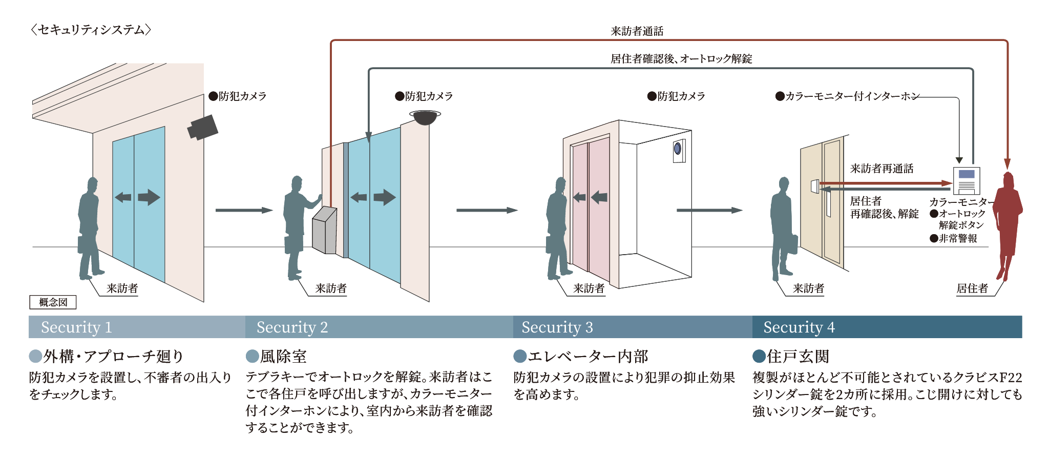 入居者の安全を守るため、共用部分から住戸に至るまで、総合的なセキュリティシステムを構築しています。
