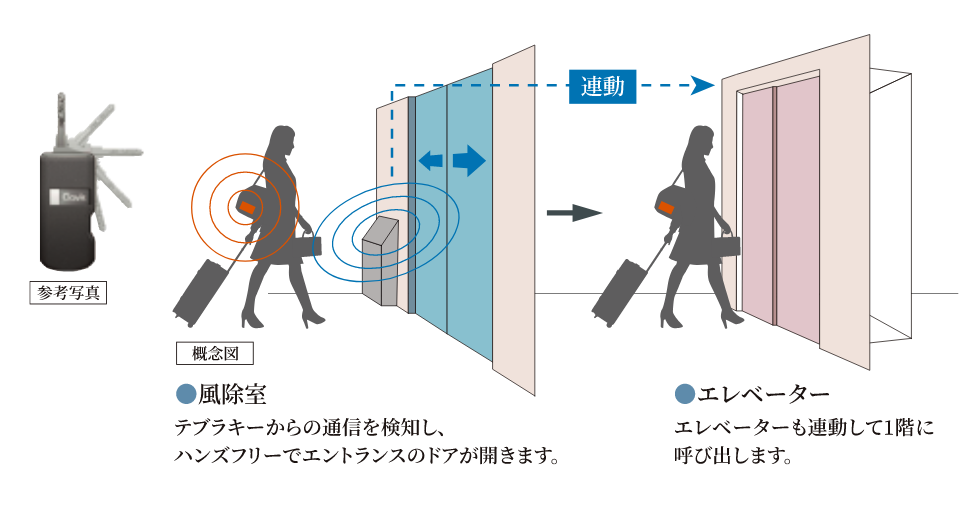 キーをカバンに入れたままエントランスのドアが開きます。かざす必要がないので、荷物で手がふさがっている時などにも便利です。