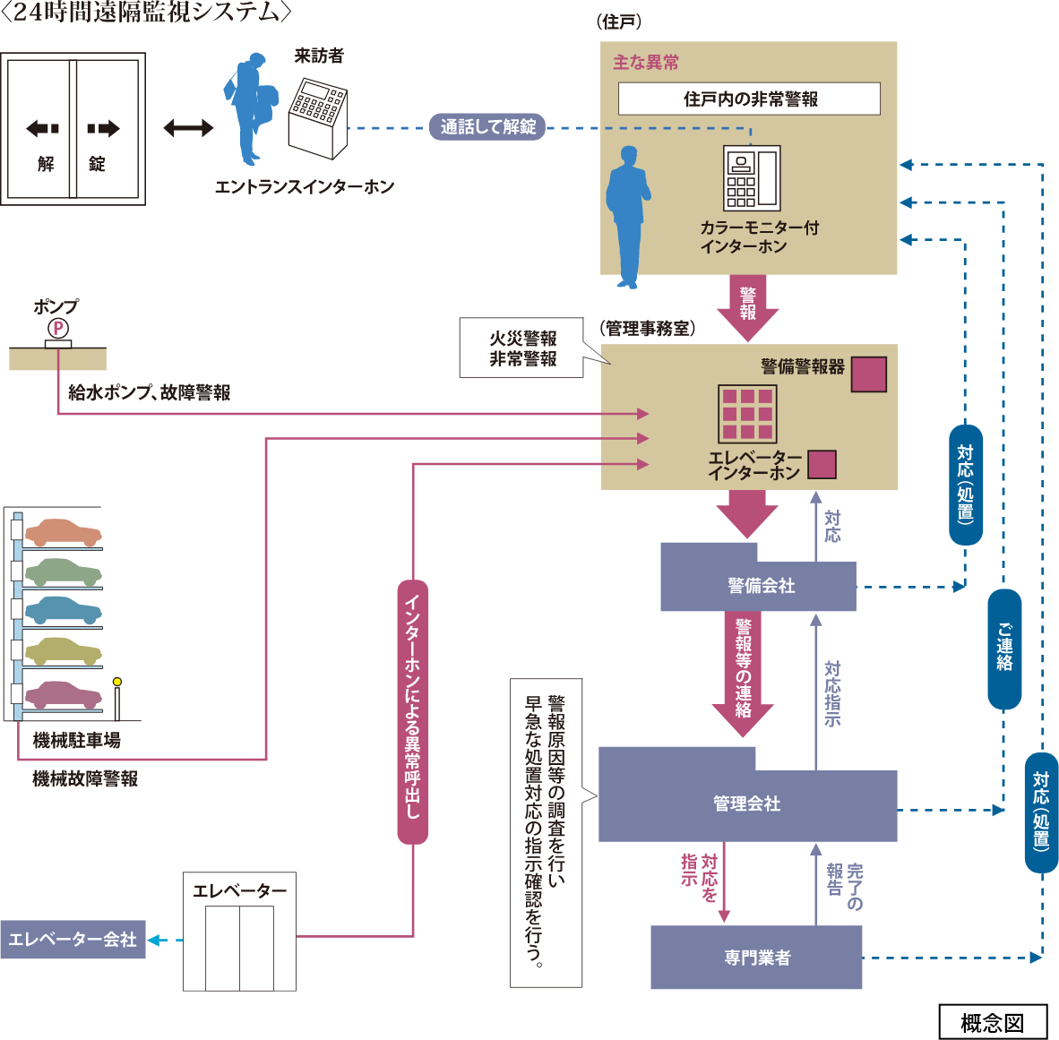 住戸内の火災、非常時などの警報装置は、24時間警備会社で監視しています。万が一の場合、警備会社のガードマンが駆けつけ、関係機関への連絡等の対応を行います。また、共用施設では、火災、給水ポンプや機械駐車場の故障なども警報装置により監視。エレベーターの運行はエレベーター会社が監視しており、停止などの異常にはエレベーター会社の担当者が迅速に駆けつけ対応します。